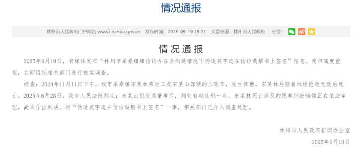 2025年9月19日,有媒体发布“林州市采桑镇镇信访办在未沟通情况下伪造其字迹在信访调解书上签名”信息。我市高度重视,立即组织相关部门进行核实调查。